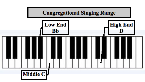 The congregational singing range principle is also a helpful tool in writing songs. Don’t go below the Bb in the diagram, or above a D in the melody. If the song is written to sing in the congregation’s range, chances are, people will be quick to join in with you (there are many other factors to consider regarding a song’s success–more for another time)! It’s really about being a servant to our congregation and not taking an opportunity to show off our vocal abilities.