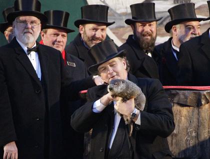 Groundhog Day, rooted in a German superstition, and started as a small gathering in 1887, is a very serious event in Punxsutawney, PA. Local folks–even thrill-seekers from all over the country–come to witness the spectacle. The event is organized by a group of leaders called “The Inner Circle.” The members of this elite group are powerful folks. They dress in 19th-century garb and, again this week, gathered around Phil’s house, agitated him until he appeared, and a small child was sure she heard him say, “As I look at the crowd on Gobbler’s Knob, many shadows do I see. So six more weeks of winter it must be!”