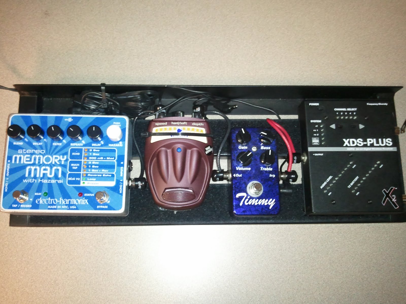 e6 XDS Plus. Line6 has upgraded their wireless line with newer models, but I still love the tone and the price–plus it has great long-distance range for big stages. This is obviously a no-fuss combination of pedals. They are all sitting atop of a Pedaltrain Mini pedal board frame and are powered by a Visual Sound- 1 Spot power supply (wires and plugs are all George L). My studio board, and another live board I have, is much more extensive. Again, when I am free to stomp, I like more stuff!